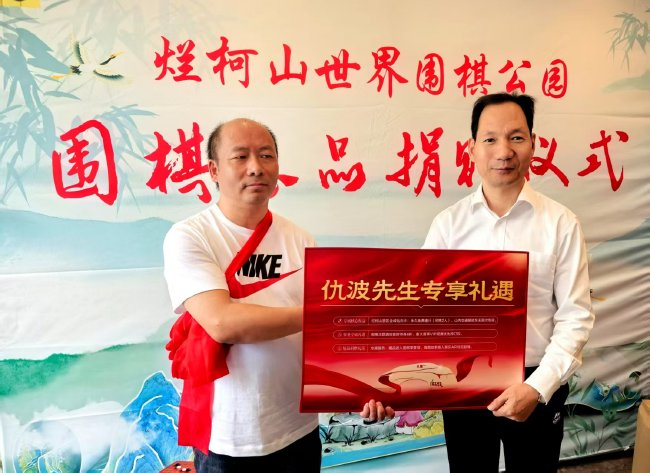 捐赠仪式上捐赠人上海中老年围棋协会副会长,上海华亭棋友会会长仇波作为001号捐赠人把他数年收藏的价值数万元人民币的上千册围棋书籍杂志及名家字画等悉数捐给烂柯山世界围棋公园展现示馆。
