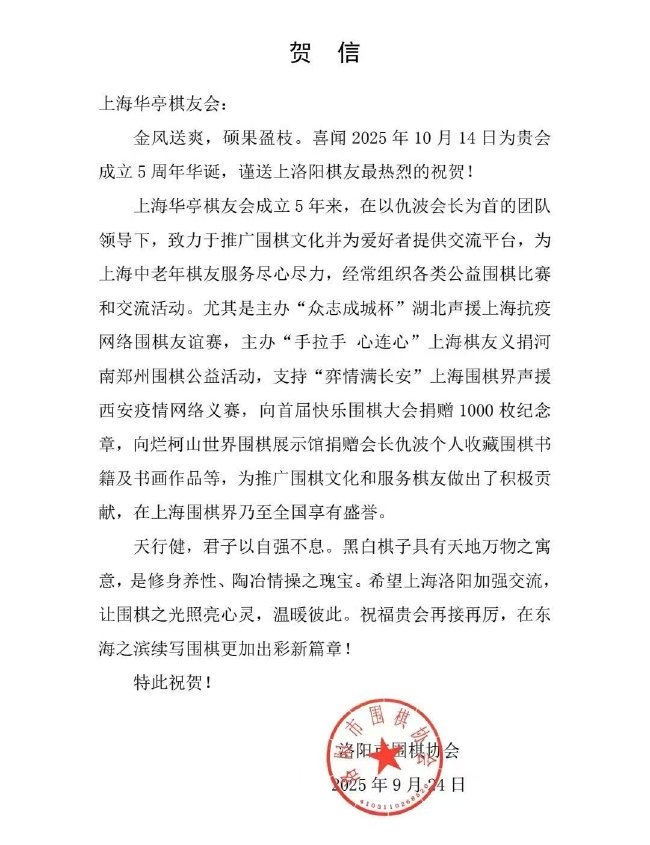 2022年1月7日晚,“申情满长安”上海西安抗疫募捐网络围棋友谊赛成功举行,通过比赛筹款援助西安疫情,并传递围棋界的团结精神。双方出场的对伍是上海联队—西安队,上海联队由职业棋手和业余棋手(含青少年)组成,部分棋手来自上海华亭棋友会围棋队。西安队由高校学生和部分业余围棋6段选手组成 。多家机构与个人参与捐款,上海华亭棋友会会长仇波代表棋友会捐款1000元,所有善款用于西安抗疫使用。通过该赛展现了两地围棋界团结互助的精神。体现了围棋社群的社会责任感!