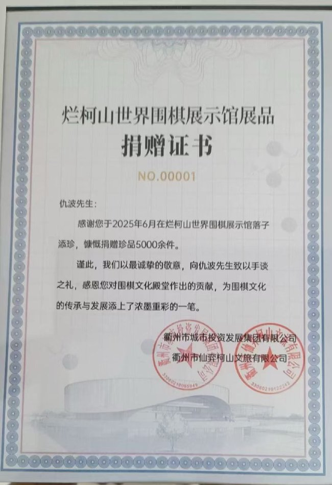 当天下午在同一地方又举行了杭州天纵围棋博物馆藏品捐赠仪式,仇波会长又有若干藏品无偿捐赠给了该博物馆。